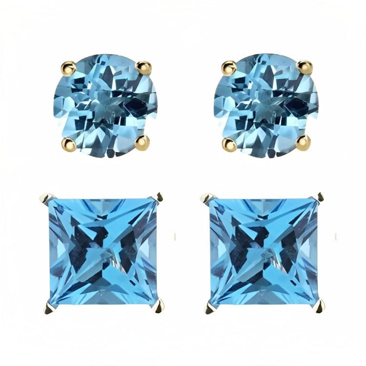 Paris Jewelry 18k Yellow Gold 2 Pair Created Blue Topaz 6mm Round & Princess Cut Stud Earrings PlatedEarrings come elegantly gift boxed. This is amazing fashion style jewelry designed in France. Metal: Yellow Gold Plated Gem Type: Created Blue Topaz CZ Earrings Stone Shape: Round & Square Size: 6mm Stone Color: Blue Setting: Prong Setting Number of Stone: 4 Style: Stud Cut Grade: Excellent Closure: Push back Country of Origin: United States- Regular price