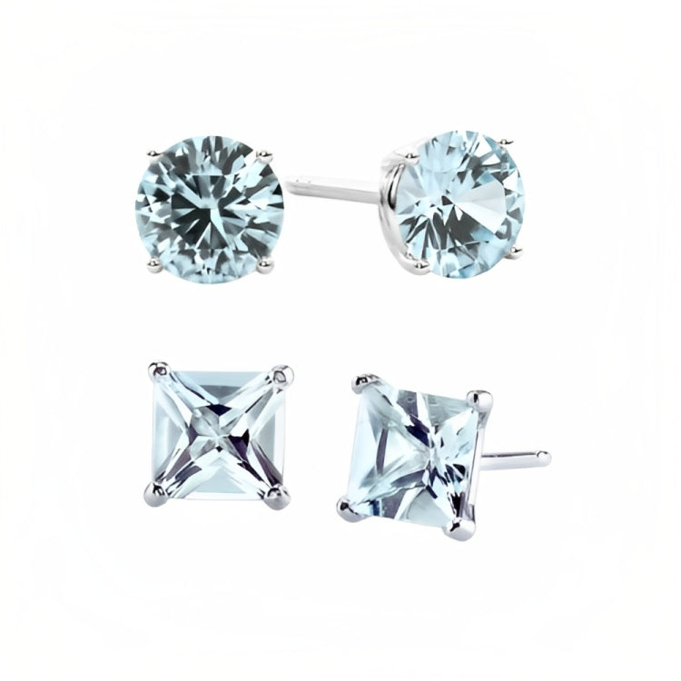 Paris Jewelry 18k White Gold 2 Pair Created Aquamarine 6mm Round & Princess Cut Stud Earrings PlatedEarrings come elegantly gift boxed. This is amazing fashion style jewelry designed in France. Metal: White Gold Plated Gem Type: Created Aquamarine CZ Earrings Stone Shape: Round & Square Size: 6mm Stone Color: Blue Setting: Prong Setting Number of Stone: 4 Style: Stud Cut Grade: Excellent Closure: Push back Country of Origin: United States- Regular price