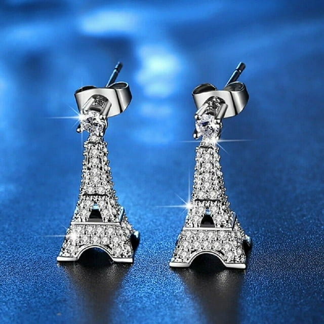 18K White Gold Brushed Small Dangling Eiffel Tower 4mm with Created White Sapphire 1/4Ct Earrings PlatedThis is an amazing fashion style of jewelry designed in France. Metal: 18k White Gold Plated Gem Type: Created White Sapphire Stone Shape: Round Stone Weight: 1/4Ct Stone Color: White Gender: Women Setting: Prong Center Stone Cut: Excellent Fastening: Push Backing Type: Earrings- Regular price