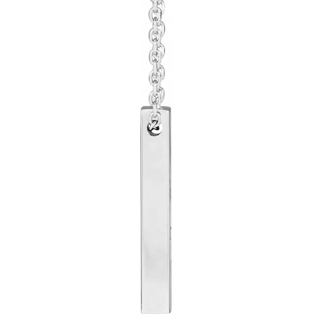 14K White Gold Engravable Four-Sided Vertical Bar 16-18" NecklaceWeight: 1.6316 DWT (2.54 grams) Clasp Type: Spring Ring Brand Name: 302 Collection: Jubilee Selling Unit of Measure: EA Solid/Hollow: Solid Gender: Ladies Plating Type: Rhodium-Plated Chain Width: 1 mm Surface Finish: Polished Primary Stone Shape: N/A Pendant Dimensions: 17x2.5 mm Diamond Clarity: N/A Diamond Color: N/A Primary Stone Type: N/A Chain Style: Cable Chain Length: 16-18 In- Regular price