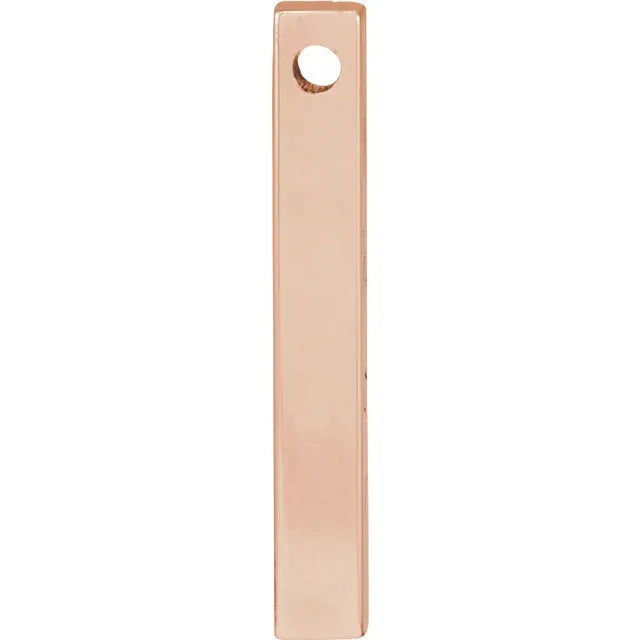 14K Rose Gold Engravable Four-Sided Vertical Bar PendantWeight: 0.827 DWT (1.29 grams) Brand Name: 302 Material: Gold Selling Unit of Measure: EA Solid/Hollow: Solid Plating Type: N/A Pendant Bail Type: No Bail Chain Length: N/A Surface Finish: Polished Pendant Dimensions: 17x2.5 mm Diamond Clarity: N/A Primary Stone Shape: N/A Primary Stone Type: N/A Diamond Color: N/A- Regular price