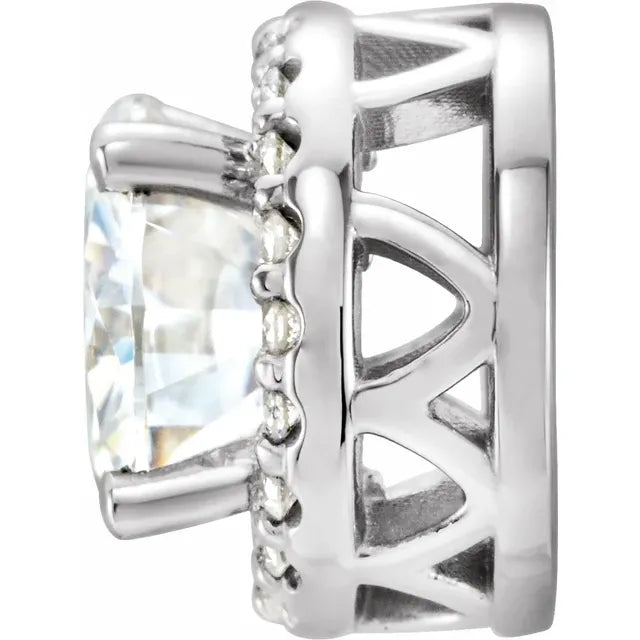 14K White Gold Forever One™ Lab-Grown Moissanite & .08 CTW Natural Diamond PendantWeight: 0.7673 DWT (1.19 grams) Approx. Height: 5.92 mm Material: Gold Selling Unit of Measure: EA Approx. Length: 9.2 mm Approx. Width: 9.24 mm Plating Type: Rhodium-Plated Surface Finish: Polished Primary Stone Shape: Round Diamond Color: G-H Diamond Clarity: I1 Primary Stone Size: 6.5 mm Primary Stone Type: Lab-Grown Moissanite Total Diamond Carat Weight: 1/10 CTW Pendant Dimensions: 9.2x9.2 mm Chain Passage Dimensions: 1.5x1.5 mm- Regular price