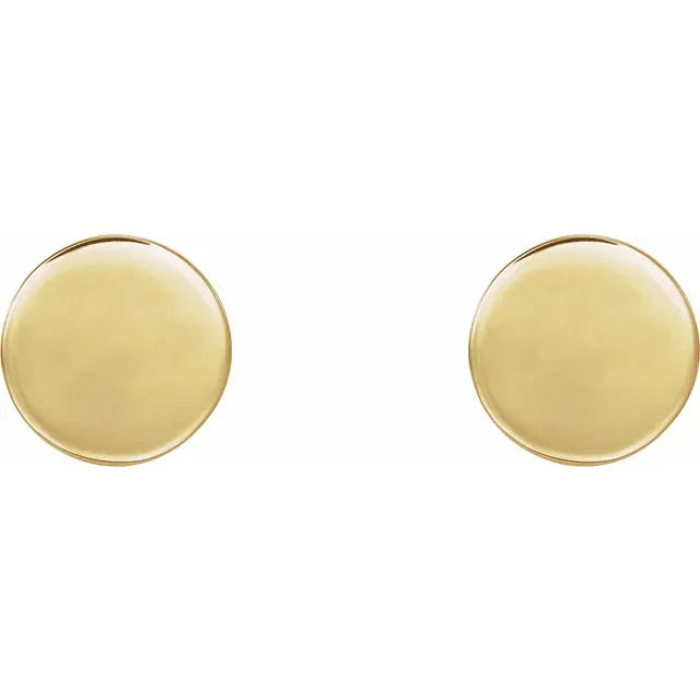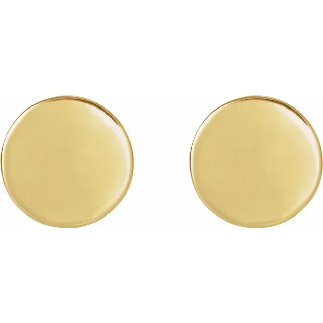 14K Yellow Gold 8 mm Engravable Disc EarringsWeight: 0.701 DWT (1.09 grams) Earring Back Type Included: Friction Backs Included Earring Closure: Friction Post and Back Earring Type: Stud Selling Unit of Measure: PR Solid/Hollow: Solid Diamond Clarity: N/A Primary Stone Type: N/A Primary Stone Shape: N/A Diamond Color: N/A Gender: Ladies Surface Finish: Polished Plating Type: N/A Earring Post Type: Friction Post Earring Dimensions: 8x8 mm- Regular price