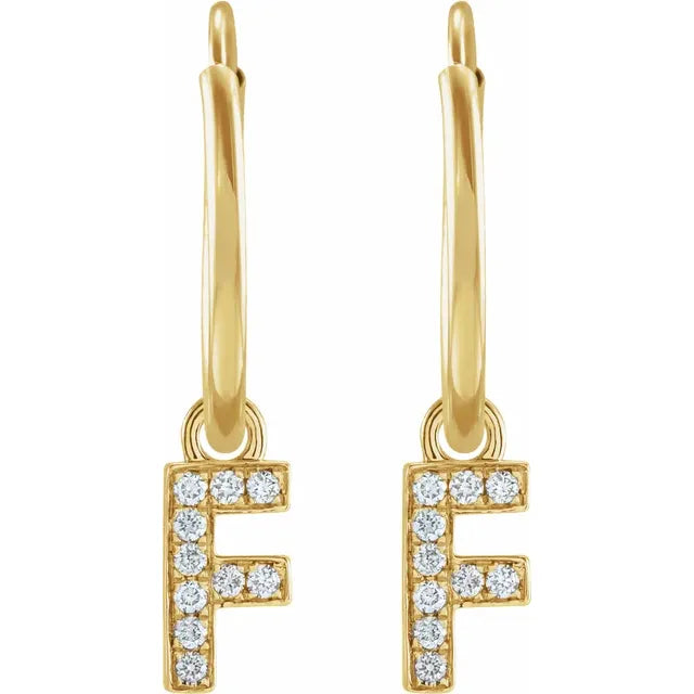 14K Yellow Gold .04 CTW Natural Diamond Single Initial F Hoop EarringWeight: 0.2185 DWT (0.34 grams) Initial/Number: F Earring Back Type Included: N/A Earring Closure: Endless Wire Earring Type: Hoop Brand Name: 302 Collection: Jubilee Selling Unit of Measure: EA Gender: Ladies Plating Type: N/A Surface Finish: Polished Primary Stone Shape: Round Diamond Clarity: I1 Diamond Color: H+ Primary Stone Type: Natural Diamond Earring Dimensions: 18.25x12 mm- Regular price