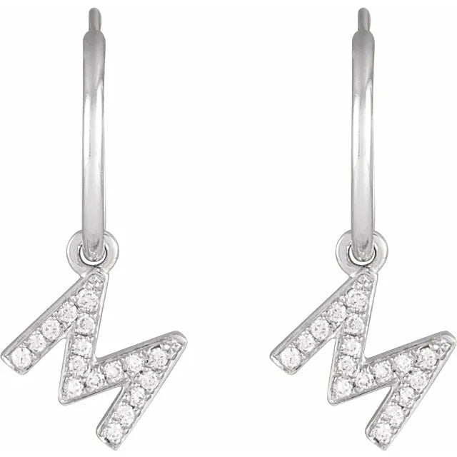 14K White Gold .06 CTW Natural Diamond Single Initial M Hoop EarringWeight: 0.3385 DWT (0.53 grams) Initial/Number: M Earring Back Type Included: N/A Earring Closure: Endless Wire Earring Type: Hoop Brand Name: 302 Collection: Jubilee Selling Unit of Measure: EA Gender: Ladies Diamond Color: H+ Primary Stone Type: Natural Diamond Diamond Clarity: I1 Primary Stone Shape: Round Plating Type: Rhodium-Plated Surface Finish: Polished Earring Dimensions: 18.3x12 mm- Regular price