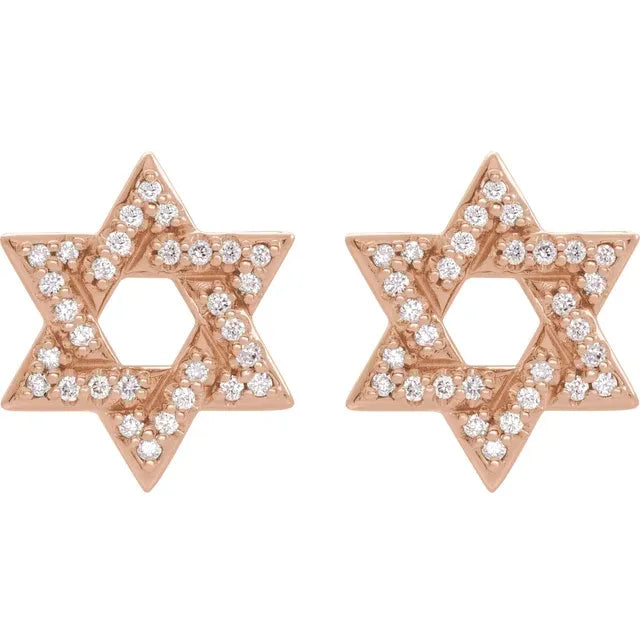 14K Rose Gold 1/8 CTW Natural Diamond Star of David EarringsWeight: 1.58 DWT (2.46 grams) Earring Back Type Included: Friction Backs Included Earring Closure: Friction Post and Back Earring Type: Drop Post Diameter: .03 In Post Length: .37 In Material: Gold Surface Finish: Polished Plating Type: N/A Primary Stone Shape: Round Primary Stone Size: .8 mm Earring Post Type: Friction Post Selling Unit of Measure: PR Approx. Height: 2.25 mm Diamond Color: G-H Primary Stone Type: Natural Diamond Primary Stone...- Regular price