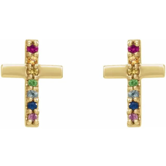 14K Yellow Gold Natural Multi-Gemstone Cross EarringsWeight: 0.4936 DWT (0.77 grams) Earring Back Type Included: Friction Backs Included Earring Closure: Friction Post and Back Earring Type: Stud Post Diameter: .03 In Post Length: .37 In Selling Unit of Measure: PR Earring Post Type: Friction Post Primary Stone Shape: Round Material: Gold Plating Type: N/A Primary Stone Size: 1 mm Surface Finish: Polished Earring Dimensions: 8.7x6.1 mm Primary Stone Count: 14-stone Primary Stone Type: Natural Multi-Gemstonea- Regular price