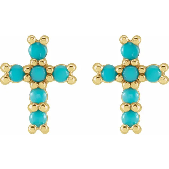 14K Yellow Gold Natural Turquoise Cross EarringsWeight: 0.9424 DWT (1.47 grams) Earring Back Type Included: Friction Backs Included Earring Closure: Friction Post and Back Earring Type: Stud Post Diameter: .03 In Post Length: .37 In Selling Unit of Measure: PR Gender: Ladies Plating Type: N/A Earring Post Type: Friction Post Surface Finish: Polished Primary Stone Shape: Round Primary Stone Size: 2 mm Diamond Clarity: N/A Diamond Color: N/A Primary Stone Count: 12-stone Primary Stone Type: Natural...- Regular price