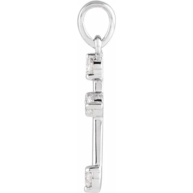 14K White Gold 1/6 CTW Natural Diamond Cross PendantWeight: 0.37 DWT (0.58 grams) Selling Unit of Measure: EA Plating Type: Rhodium-Plated Surface Finish: Polished Primary Stone Shape: Round Pendant Bail Type: Tapered Primary Stone Size: 2 mm Diamond Clarity: I1 Diamond Color: G-H Total Diamond Carat Weight: 1/6 CTW Primary Stone Count: 5-stone Primary Stone Type: Natural Diamond Chain Passage Dimensions: 3x2.2 mm Pendant Dimensions: 21.11x10.3 mm Chain Length: N/A- Regular price