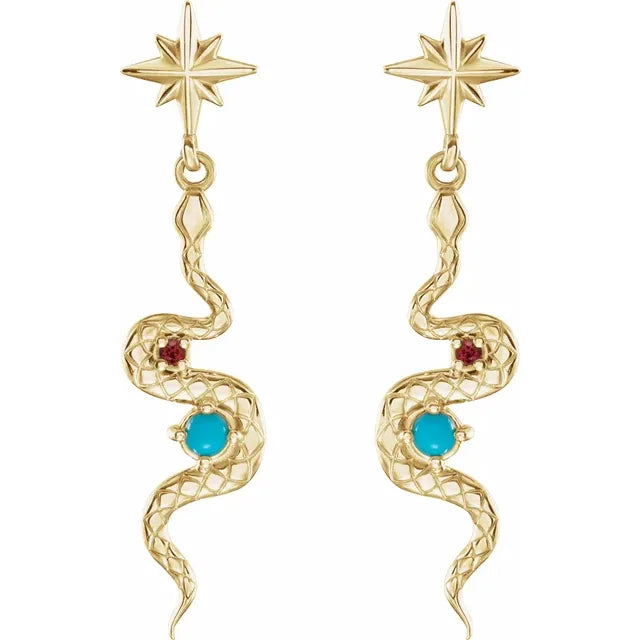 14K Yellow Gold Natural Turquoise & Natural Ruby Snake EarringsWeight: 1.3164 DWT (2.05 grams) Earring Back Type Included: Friction Backs Included Earring Closure: Friction Post and Back Earring Type: Dangle Post Diameter: .03 In Post Length: .37 In Selling Unit of Measure: PR Primary Stone Type: Natural Turquoise Diamond Color: N/A Primary Stone Size: 2 mm Earring Dimensions: 22.44x6.76 mm Primary Stone Count: 2-stone Diamond Clarity: N/A Primary Stone Shape: Round Earring Post Type: Friction Post Gender: Ladies Surface...- Regular price