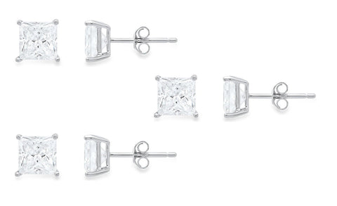 10k White Gold Plated Created White Sapphire 4Ct Princess Cut Set Of Three Stud Earrings