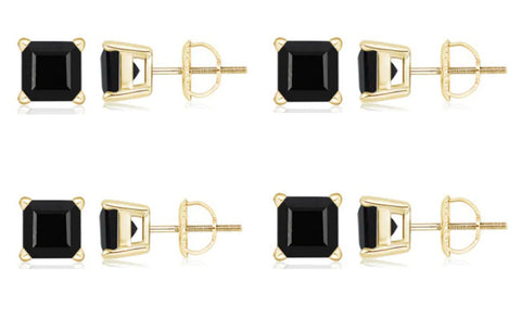 10k Yellow Gold Plated Created Black Sapphire 4Carat Square Cut Pack of Four Stud Earrings