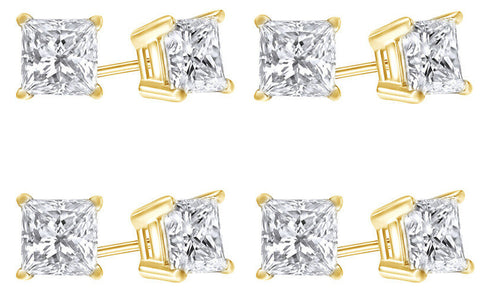 10k Yellow Gold Plated Created White Sapphire 1 Carat Princess Cut Pack of Four Stud Earrings
