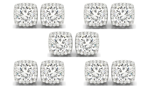 14k White Gold 6mm 2Ct Cushion Cut White Sapphire Set Of Five Halo Stud Earrings Plated