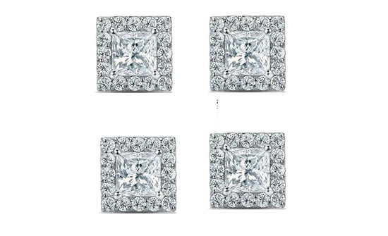 14k White Gold Plated 4mm 2Ct Princess Cut White Sapphire Set of Two Halo Stud Earrings