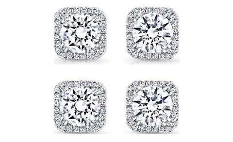 14k White Gold Plated 4mm 3Ct Square Cut White Sapphire Set of Two Halo Stud Earrings