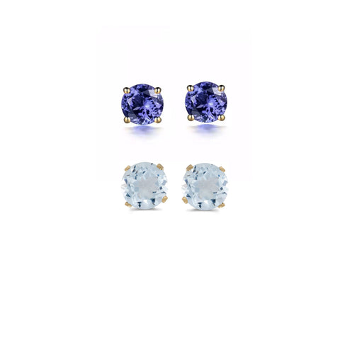 14k Yellow Gold Plated 1Ct Created Tanzanite and Aquamarine 2 Pair Round Stud Earrings