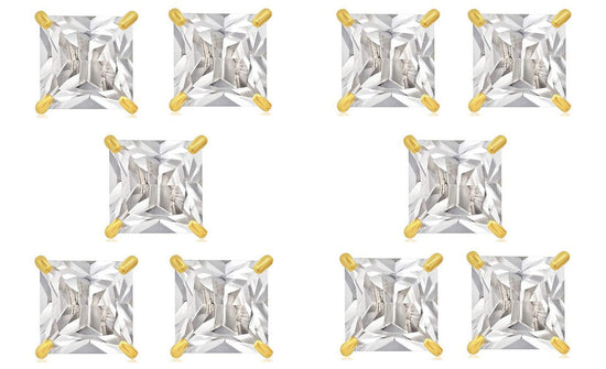 14k Yellow Gold Plated 1Ct Square Cut White Sapphire Set Of Five Stud Earrings
