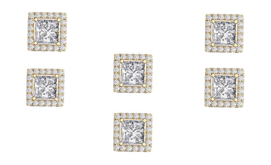 14k Yellow Gold Plated 1Ct Square Cut White Sapphire Set of Three Halo Stud Earrings