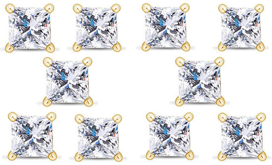14k Yellow Gold Plated 2Ct Princess Cut White Sapphire Set Of Five Stud Earrings
