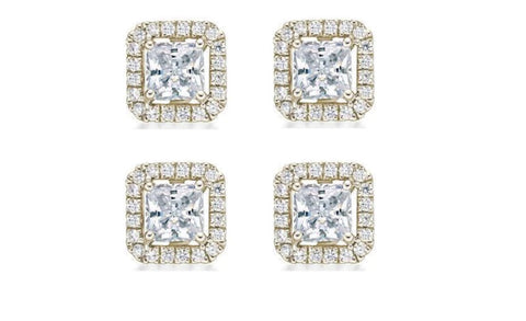 14k Yellow Gold Plated 2Ct Princess Cut White Sapphire Set of Two Halo Stud Earrings