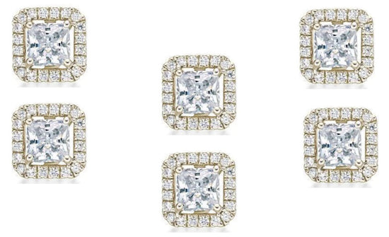14k Yellow Gold Plated 4mm 3Ct Princess Cut White Sapphire Set of Three Halo Stud Earrings