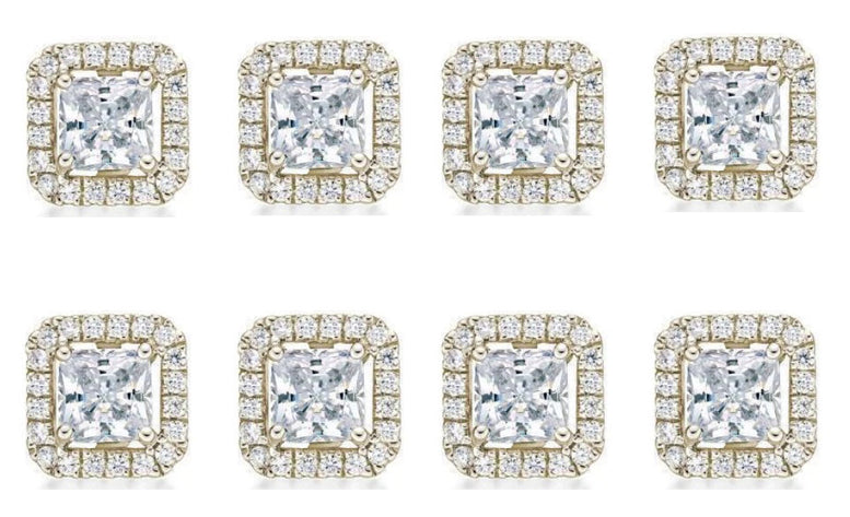 14k Yellow Gold Plated 6mm 1Ct Princess Cut White Sapphire Set of Four Halo Stud Earrings