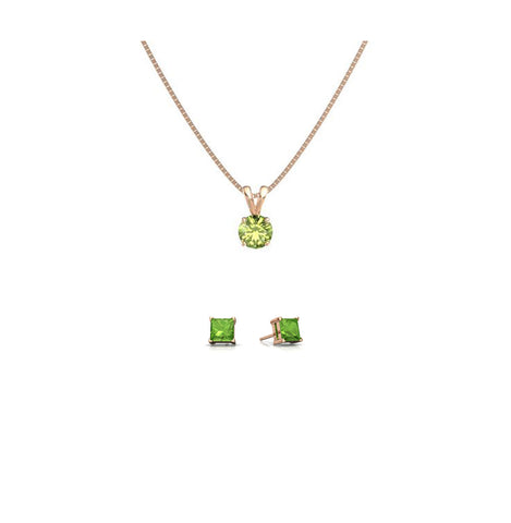 18K Rose Gold 1ct Peridot Round 18 Inch Necklace and Square Earrings Set Plated
