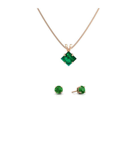 18K Rose Gold 2ct Emerald Princess Cut 18 Inch Necklace and Round Earrings Set Plated