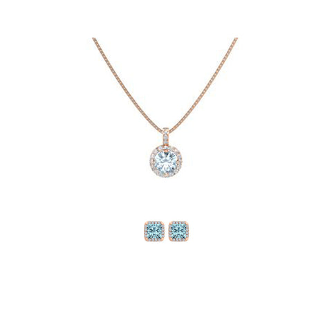 18K Rose Gold 2ct Halo Aquamarine Round 18 Inch Necklace and Halo Square Earrings Set Plated
