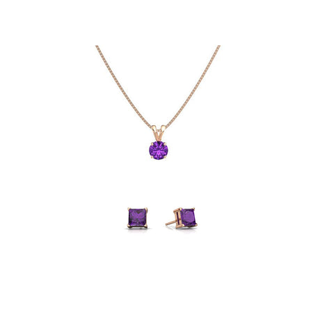 18K Rose Gold 3ct Amethyst Round 18 Inch Necklace and Square Earrings Set Plated