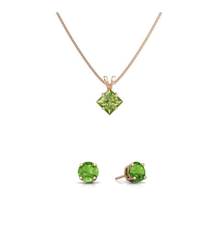 18K Rose Gold 3ct Peridot Princess Cut 18 Inch Necklace and Round Earrings Set Plated