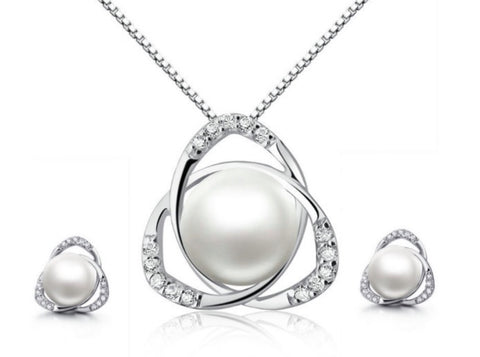 18K White Gold 2 ct Pearl Halo Round 18 Inch Necklace and Earrings Set Plated