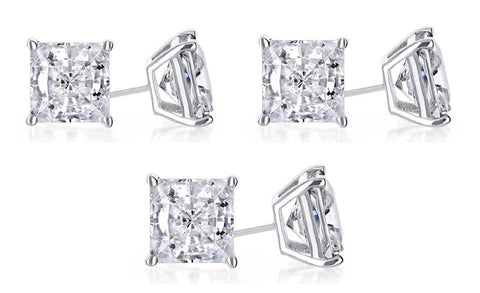 18k White Gold Plated 1Ct Princess Cut White Sapphire Set Of Three Stud Earrings