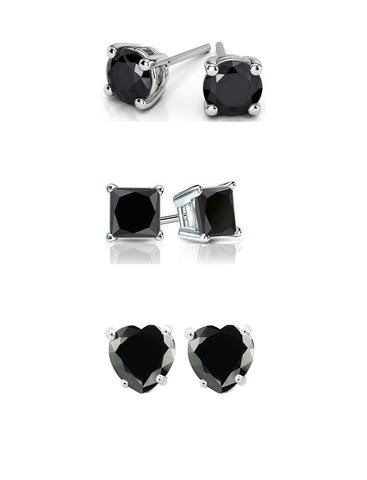 18k White Gold Plated 1Cttw 7mm Created Black Sapphire 3 Pair Round, Square and Heart Stud Earrings