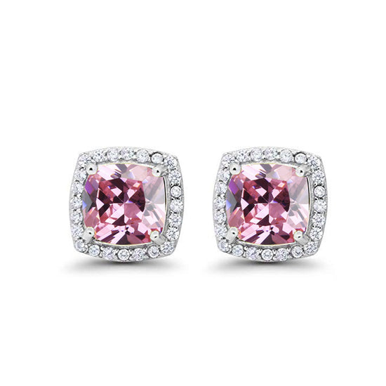 18k White Gold Plated 2 Ct Created Halo Princess Cut Pink Sapphire Stud Earrings