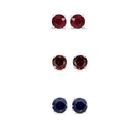 18k White Gold Plated 2Ct Created Ruby, Garnet and Black Sapphire 3 Pair Round Stud Earrings