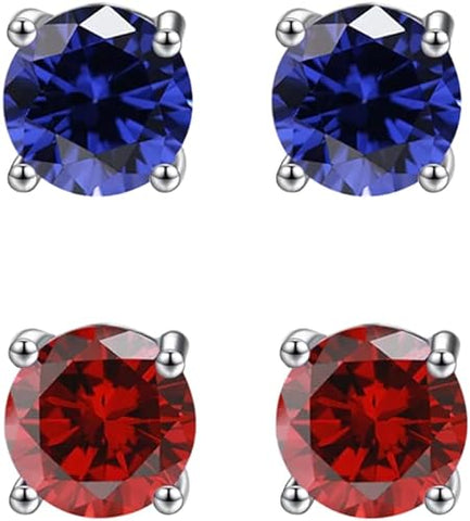 18k White Gold Plated 3Ct Created Blue sapphire and Ruby 2 Pair Round Stud Earrings