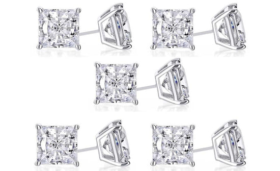 18k White Gold Plated 6mm 1Ct Princess Cut White Sapphire Set Of Five Stud Earrings