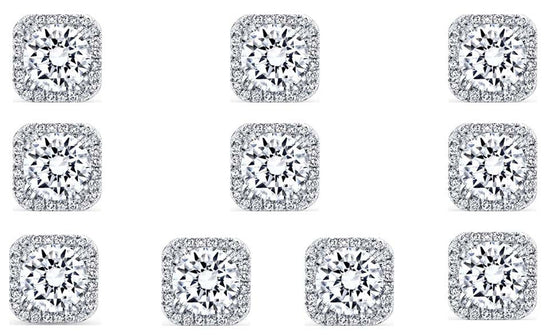 18k White Gold Plated 6mm 1Ct Square Cut White Sapphire Set of Five Halo Stud Earrings