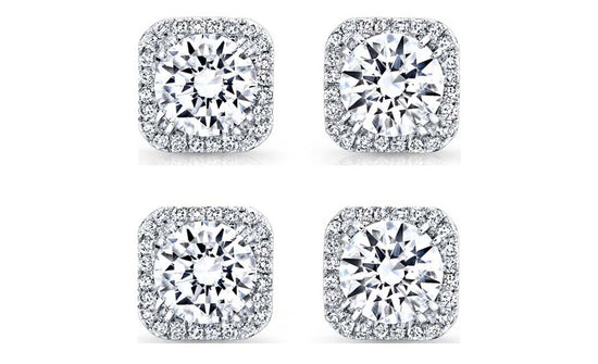 18k White Gold Plated 6mm 4Ct Square Cut White Sapphire Set of Two Halo Stud Earrings