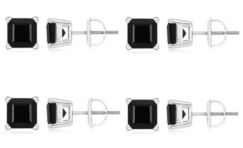 18k White Gold Plated Created Black Sapphire 2Ct Square Cut Pack of Four Stud Earrings