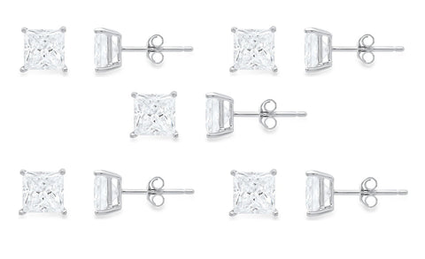 18k White Gold Plated Created White Sapphire 1/2Ct Princess Cut Set Of Five Stud Earrings