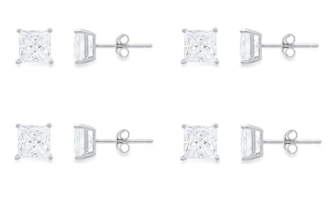 18k White Gold Plated Created White Sapphire 4Ct Princess Cut Set Of Four Stud Earrings