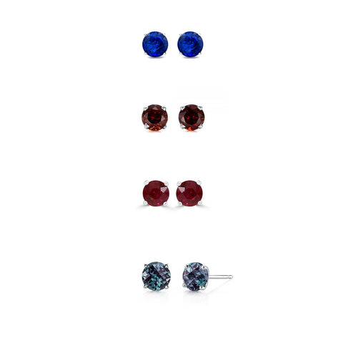 18k White Gold Plated Ct Created Blue Sapphire, Garnet, Ruby and Alexandrite 4 Pair Round Stud Earrings