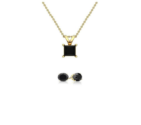 18K Yellow Gold 1/2ct Black Sapphire Princess Cut 18 Inch Necklace and Round Earrings Set Plated