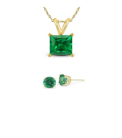 18K Yellow Gold 1/2ct Emerald Princess Cut 18 Inch Necklace and Round Earrings Set Plated