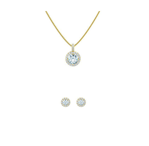 18K Yellow Gold 2ct  Halo Aquamarine Round 18 Inch Necklace and Halo Earrings Set Plated
