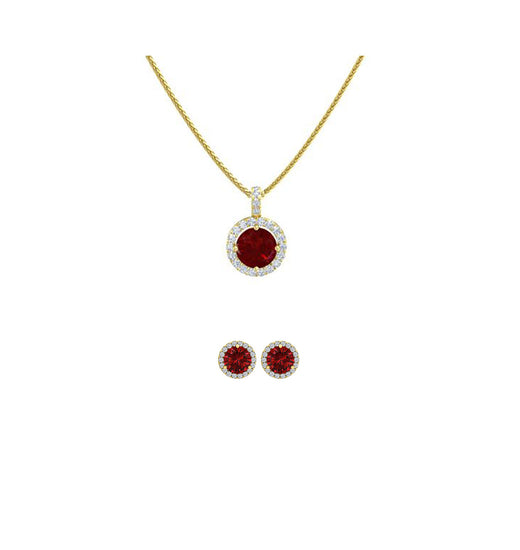 18K Yellow Gold 4ct Halo Ruby Round 18 Inch Necklace and Halo Earrings Set Plated