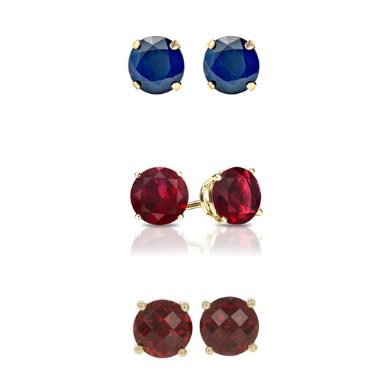 18k Yellow Gold Plated 1/2Ct Created Blue Topaz, Ruby and Garnet 3 Pair Round Stud Earrings